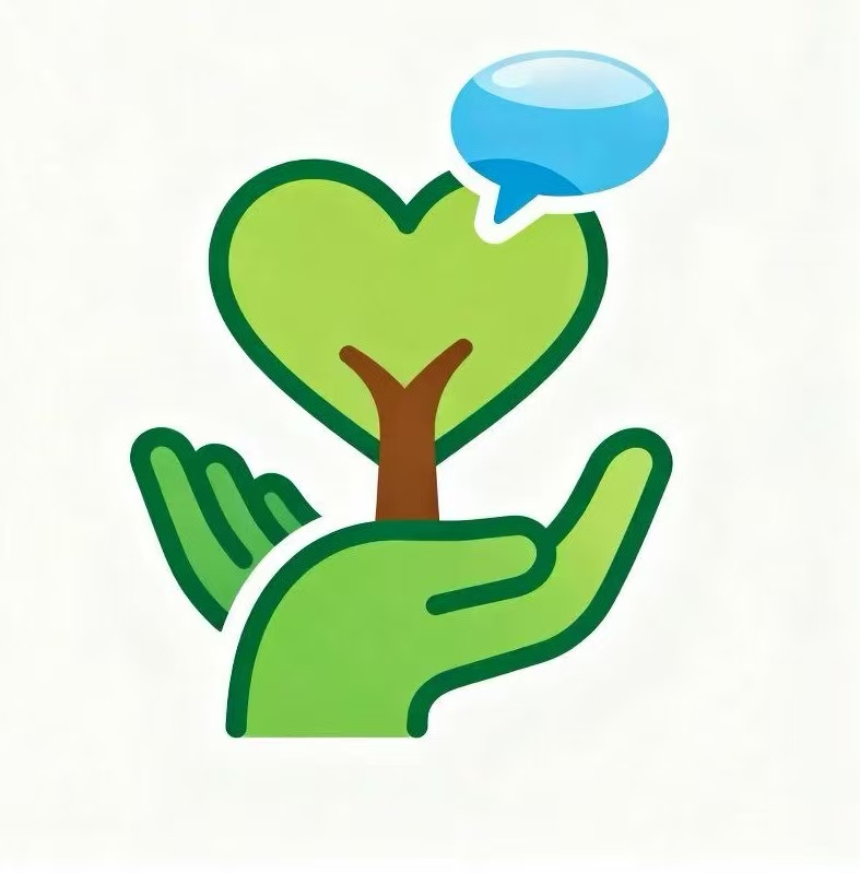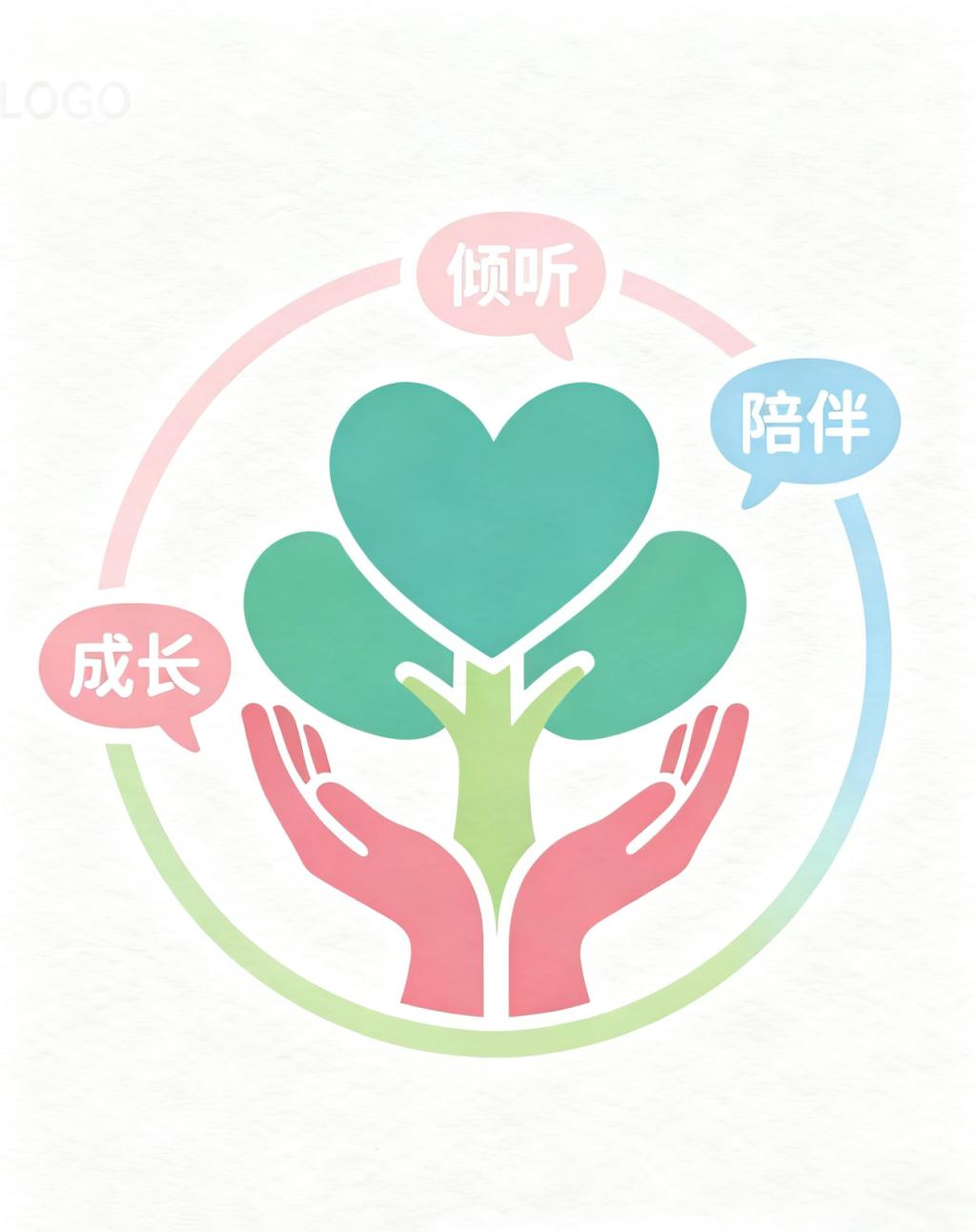 心形是情感、心灵的符号,树代表成长、生命力,结合来象征心灵的健康成长——既包含情绪的滋养,也指向心理状态的成熟。双手是接纳、保护、支持的动作,对应心理层面的安全感与被呵护的需求,暗示个体在心理成长中需要外界的包容与托举。气泡是表达、倾诉的载体,与心形树相结合,指向心理表达的必要性。