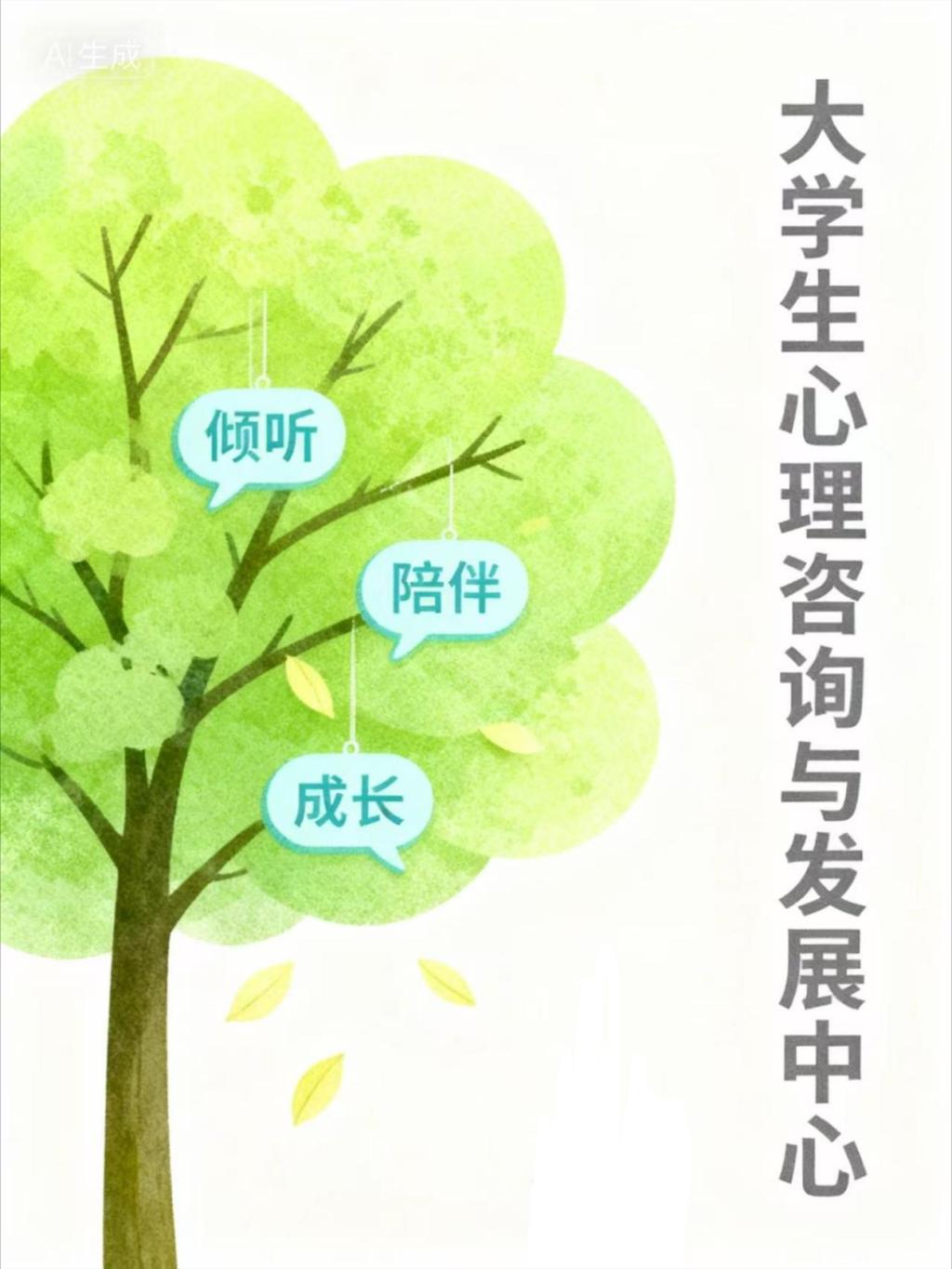 大树象征心理支持的稳固载体——对应咨询中心是大学生心灵的安全基地,能承载情绪、提供庇护;枝叶的舒展感,也暗示心理状态从压抑到舒展的过程。这个设计精准契合了大学生的心理需求- 大学生正处于自我整合的阶段,既需要外界的倾听,也需要情感上的陪伴。水彩风格的柔和色调、自然的树木元素,弱化了心理咨询可能带来的标签感,传递出心理关怀是日常成长的一部分的理念。