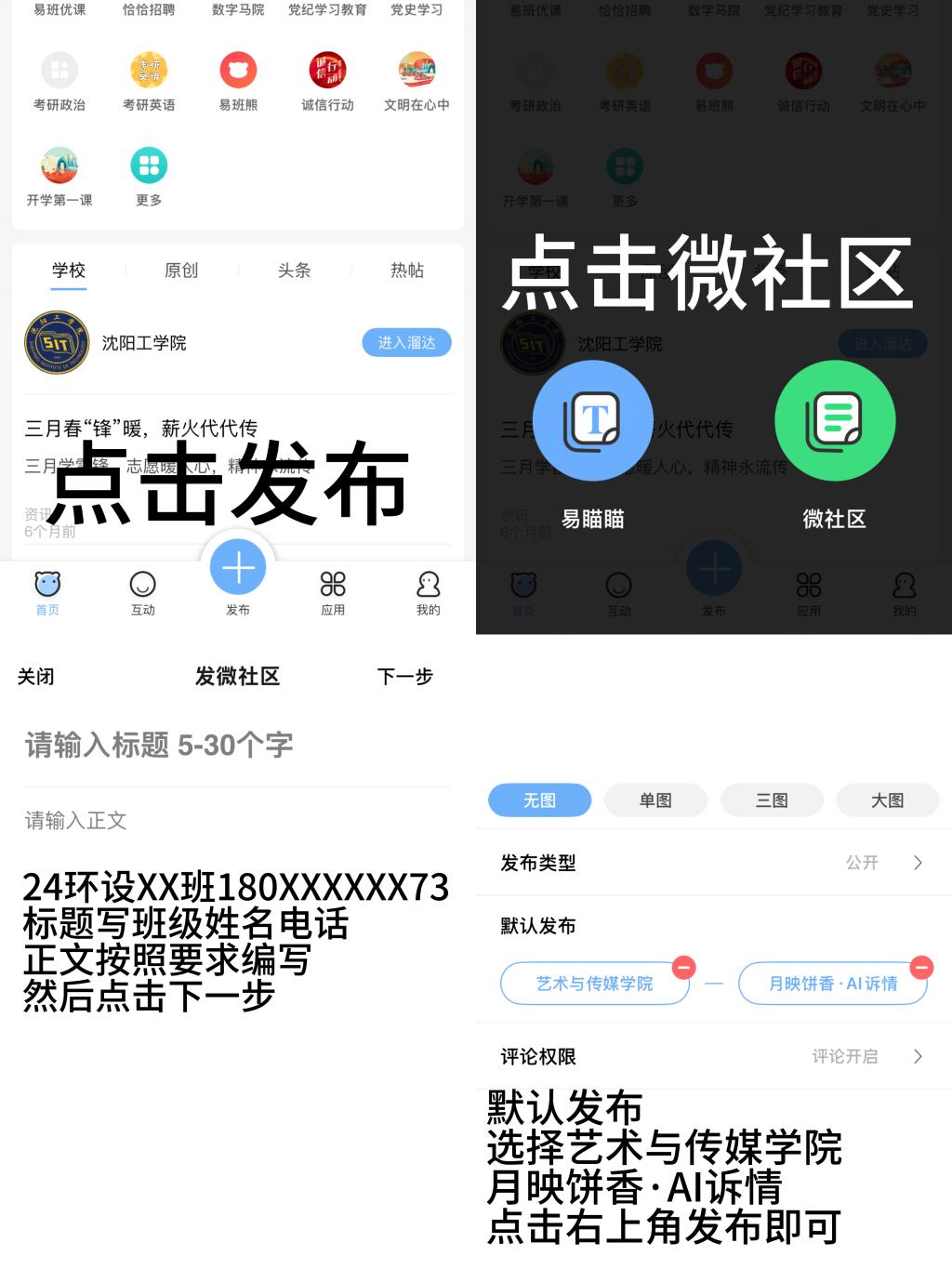2、参与方式将图片发送到易班APP微社区“月映饼香·AI诉情”活动板块,操作流程见下方图片。提交时附上参与人员的信息(班级+姓名+电话)。
