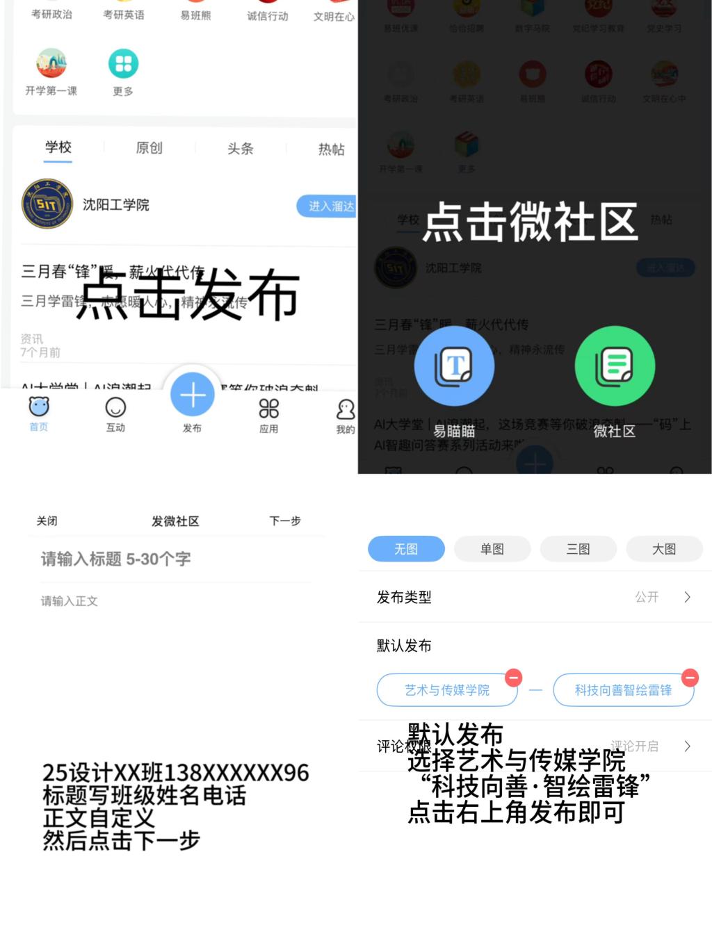 2、参与方式将图片发送到易班APP微社区“科技向善·智绘雷锋”活动板块,操作流程见下方图片。提交时附上参与人员的信息(班级+姓名+电话)。