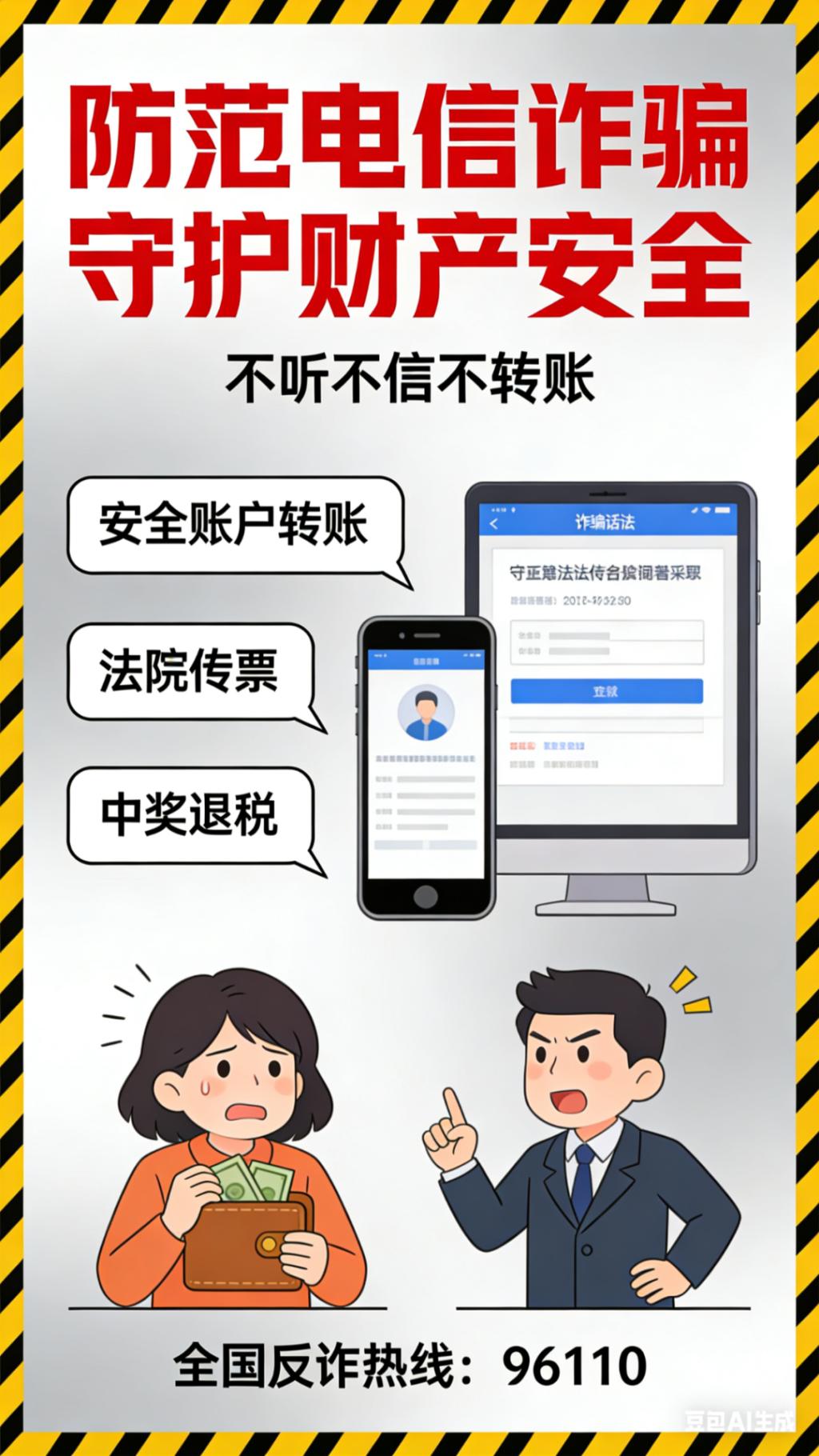 诈骗分子假扮警察、检察官等身份,声称你涉嫌违法犯罪,发送虚假通缉令、传票制造恐慌,要求你将资金转入“安全账户”自证清白。谨记:公检法机关无安全账户,绝不会电话线上办案。