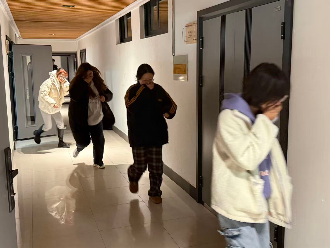 随着消防警报响起,实战演练正式开始。同学们在工作人员引导下,弯腰低姿、捂住口鼻,沿预设路线迅速有序撤离,全程沉着冷静、配合默契,很快到达安全区域。