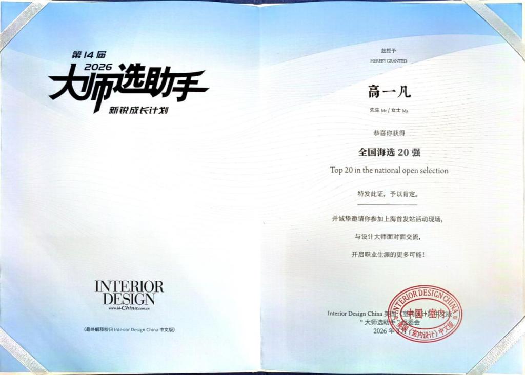 2026年4月1日,第14届“大师选助手”新锐成长计划比赛及系列论坛在上海市举行,艺术与传媒学院环境设计专业2023级学生高一凡、崔嫄坤获得全国海选20强,并一同获得全国知名设计企业“浆果设计研究所”实习工作资格。环境设计专业带头人杨凯老师受邀在赛事论坛中分享我校专业项目化教学模式。