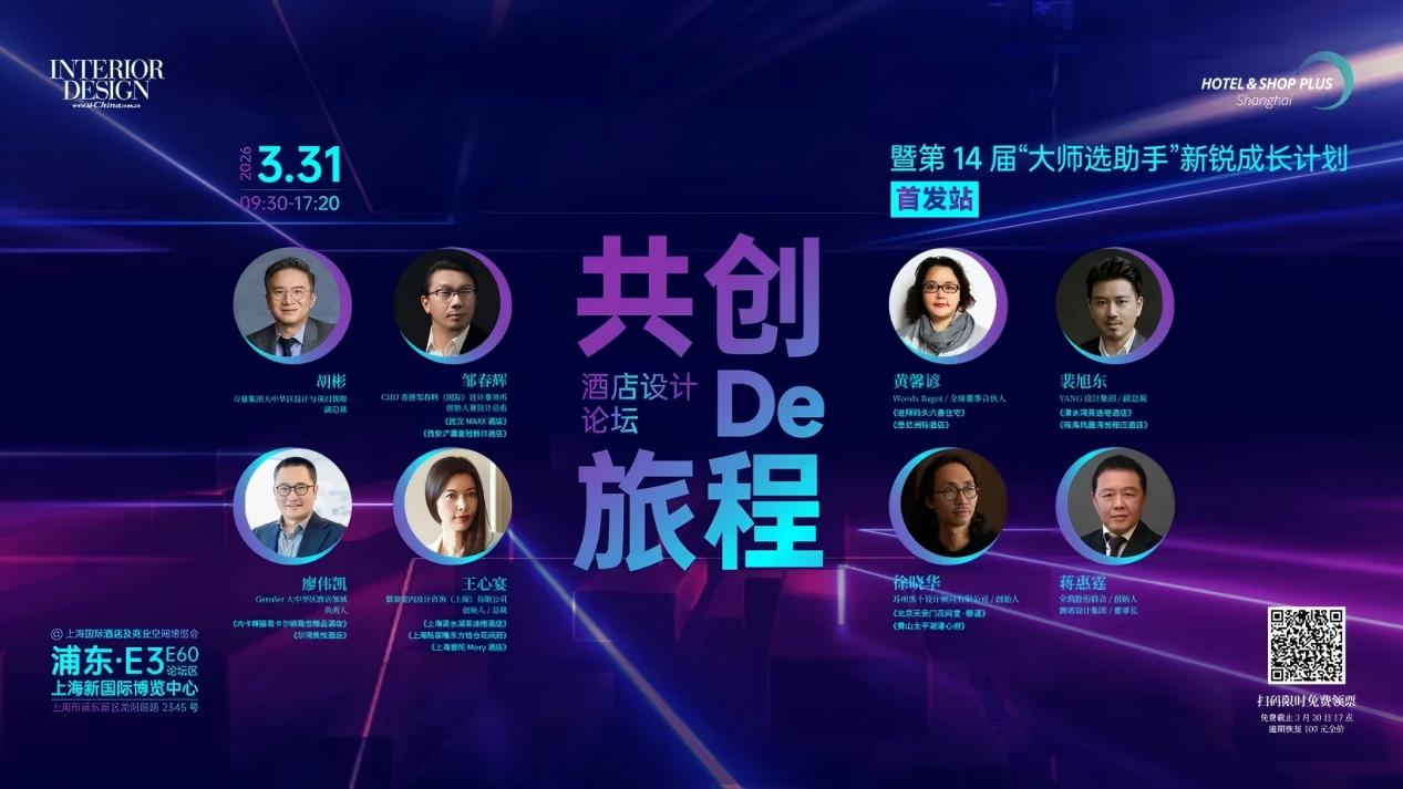 蒋惠霆等多位设计大师参与。如今,“大师选助手”已成为中国室内设计领域最具影响力的青年成长助推平台。今年,主办方首次将其纳入“共创的旅程”酒店设计论坛,于2026上海国际酒店及商业空间博览会期间隆重举行,聚焦行业人才传承与就业支持,特别为设计专业学子与青年设计师提供与大师直面学习、进入一线团队实践的珍贵机会。