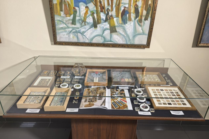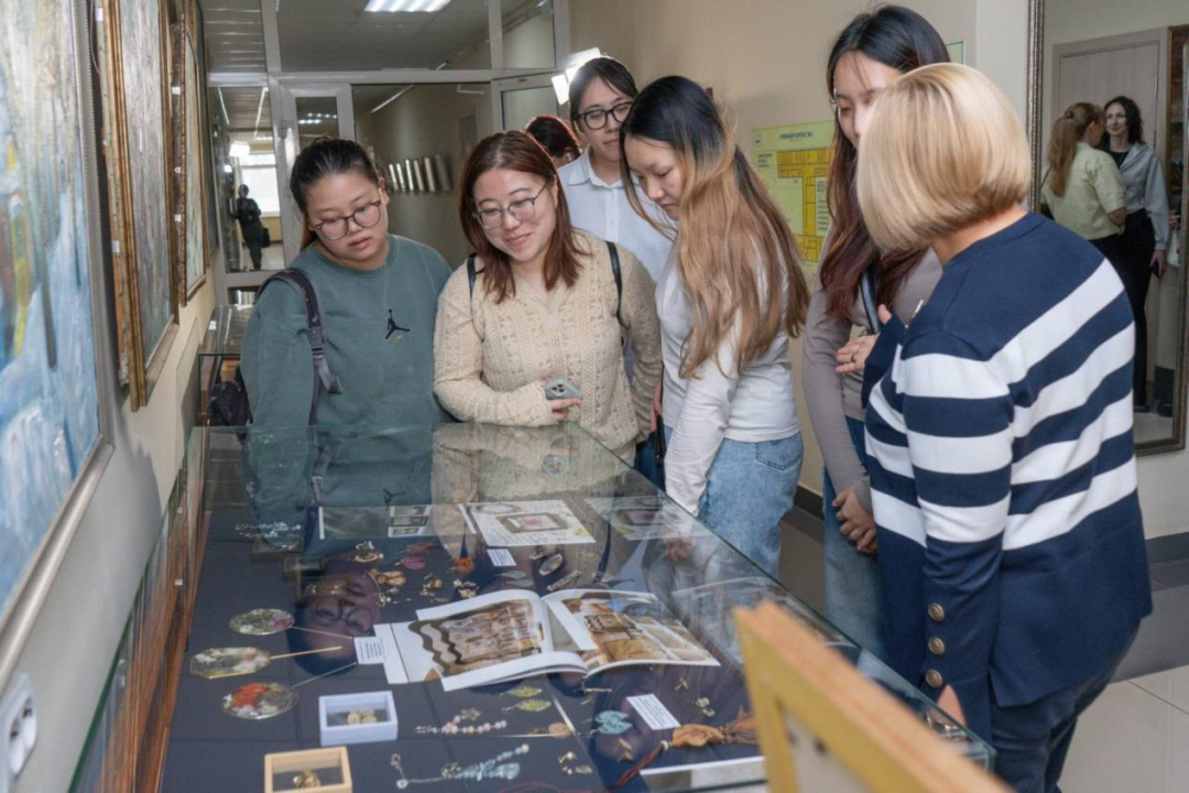 作为此次访学的“重头戏”,我校访学团队精心策划的《植物里的故事集》文创作品交流展在克麦罗沃国立文化学院展厅隆重开展,成为两校文化艺术交流的重要亮点。展览共展出我校学生创作的40余件作品,涵盖定格植物肌理的标本画、摆台首饰、植物认知教具和蓝染工艺文创等多个品类。这些作品以中国传统植物文化为创作核心,融入现代设计理念,植物纹样的蓝染丝巾等作品兼具文化内涵与实用价值。俄方高度重视此次展览,特别邀请库兹巴斯美术博物馆副主任玛丽娜·尤里耶夫娜·切尔托戈娃、“托马斯克书写家”自然保护区博物馆馆长马克西姆·维克托罗维奇·戈洛文出席并致辞。展览作品以独特的创意视角和鲜明的文化特色,赢得俄方嘉宾及师生的高度评价,充分展现了我校艺术专业学生的创作实力与创新思维。