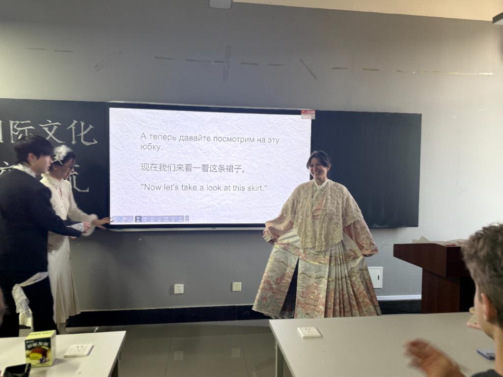 课堂现场,时尚传播专业学子身着典雅旗袍,化身文化讲解员,生动介绍中国传统服饰。从旗袍的温婉韵味、剪裁精髓,到马面裙的历史传承、纹样美学,娓娓道来间尽显中华服饰魅力。为让俄罗斯友人沉浸式体验,现场特设马面裙试穿环节,邀请一位俄罗斯友人上台试穿,传统服饰与异域风采碰撞,尽显文化交融之美。