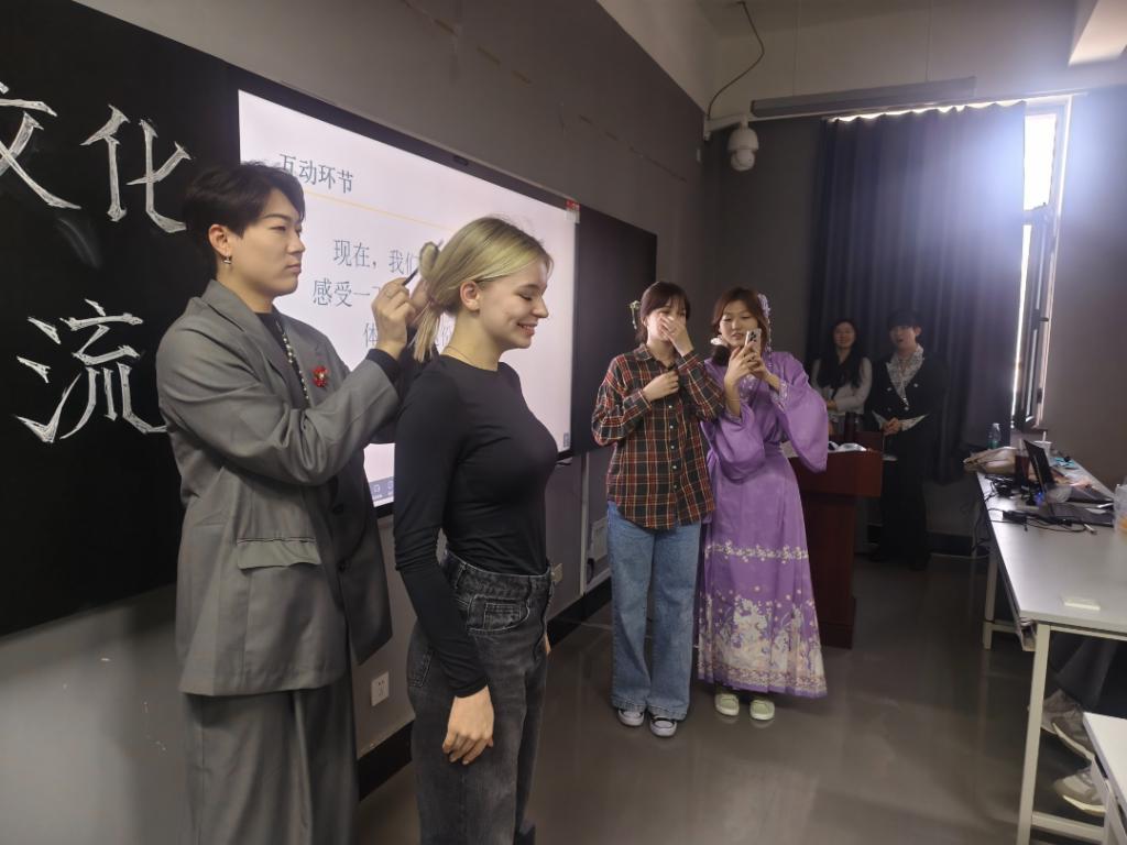 随后,大家聚焦中国发簪,聆听其历史底蕴与装饰巧思。时传学子精心准备发簪作为礼物,亲手为俄罗斯友人佩戴,小小发簪承载中俄美好情谊,让文化交流更具温度